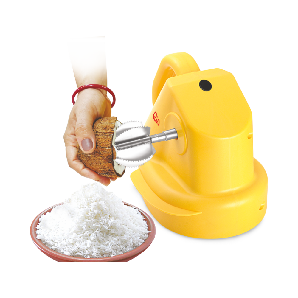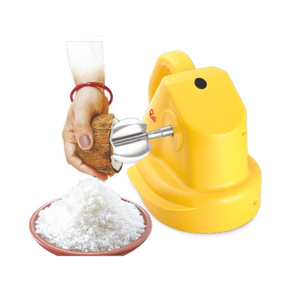 - Switch ON and gently rotate the coconut half against the blade for complete scraping.